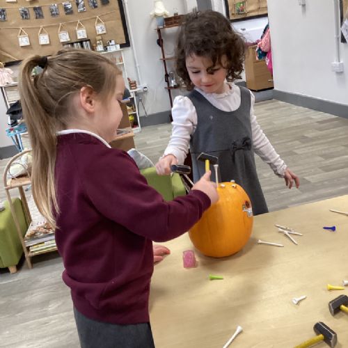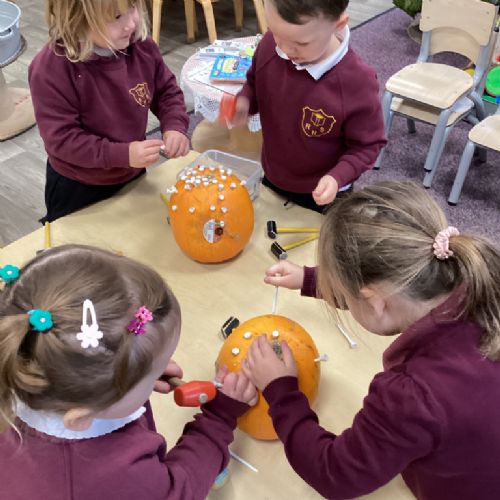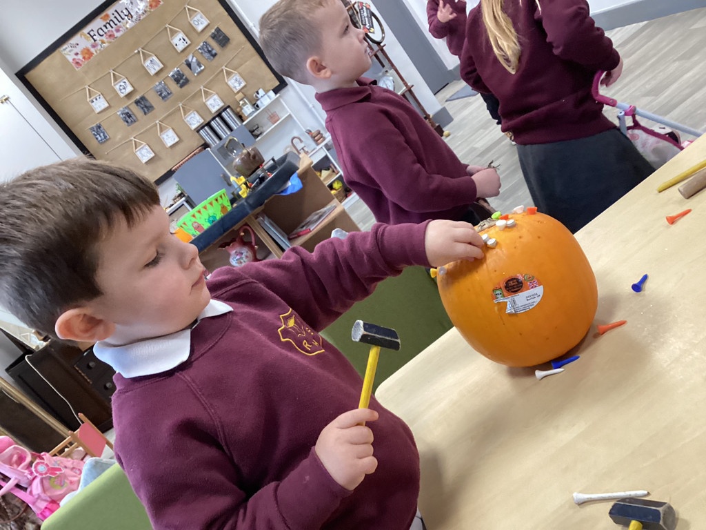 The Nursery 3s  children used their fine motor control to hammer in the tees into pumpkins.