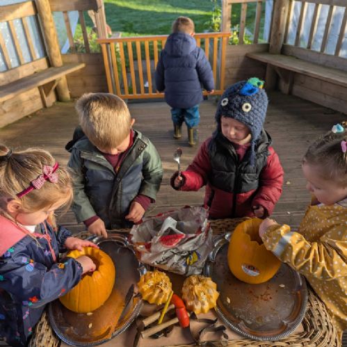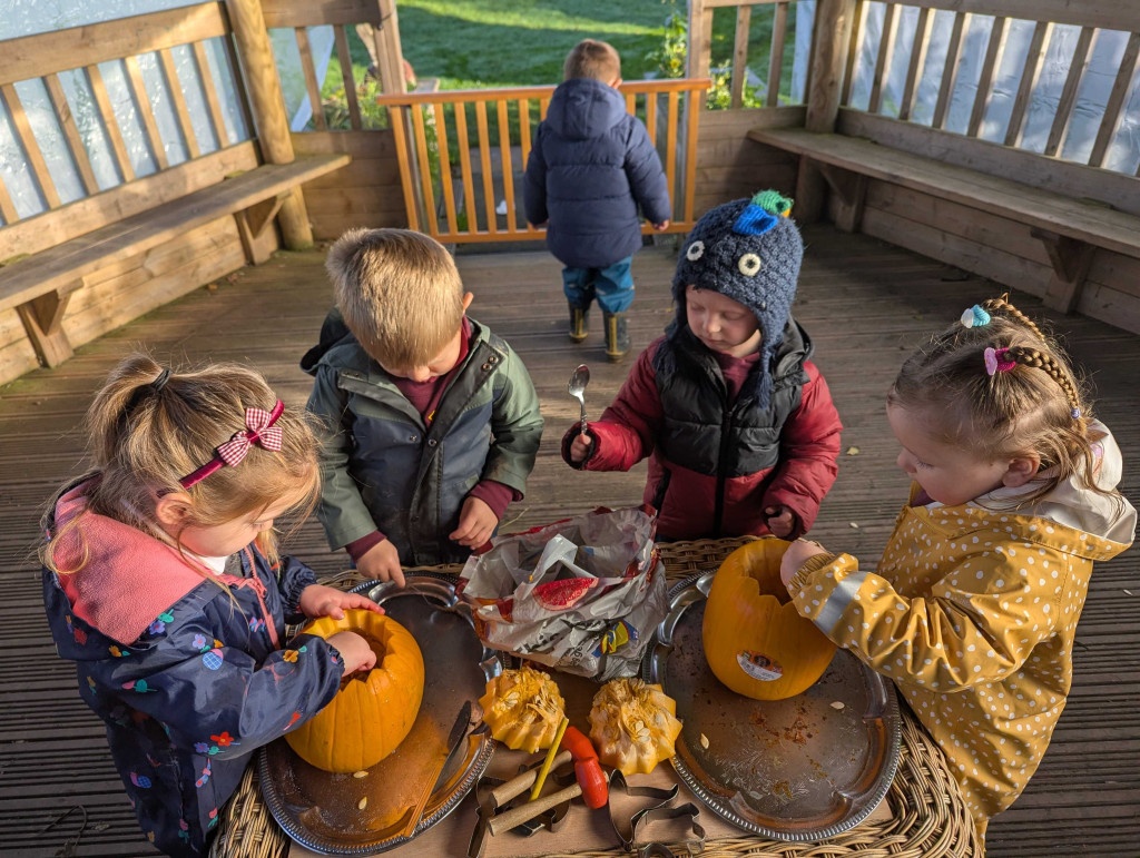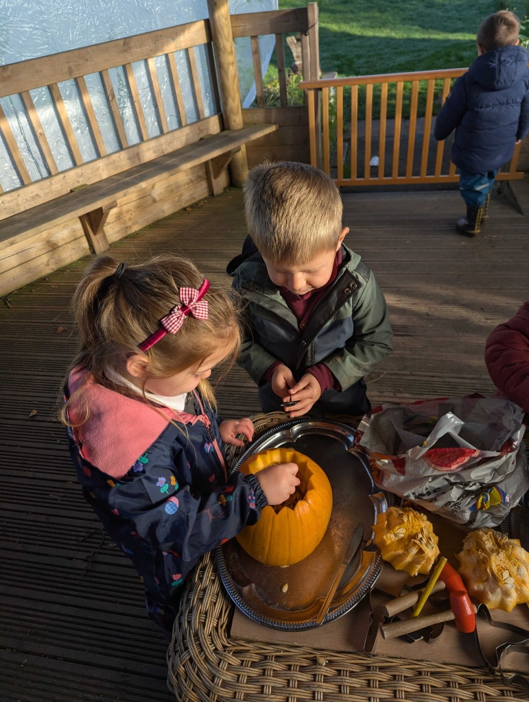 The Nursery 3s children spent some of their forest school session carving pumpkins. They used different tools and talked about the flesh and seeds inside the pumpkins. They talked about the growth from seed to pumpkin and what was needed to make the pumpkin grow!