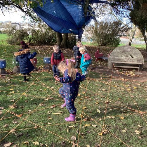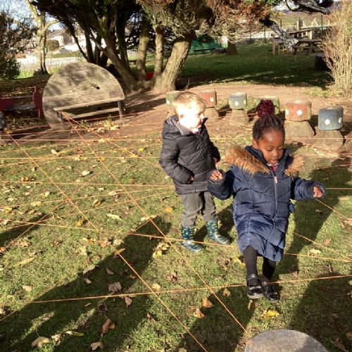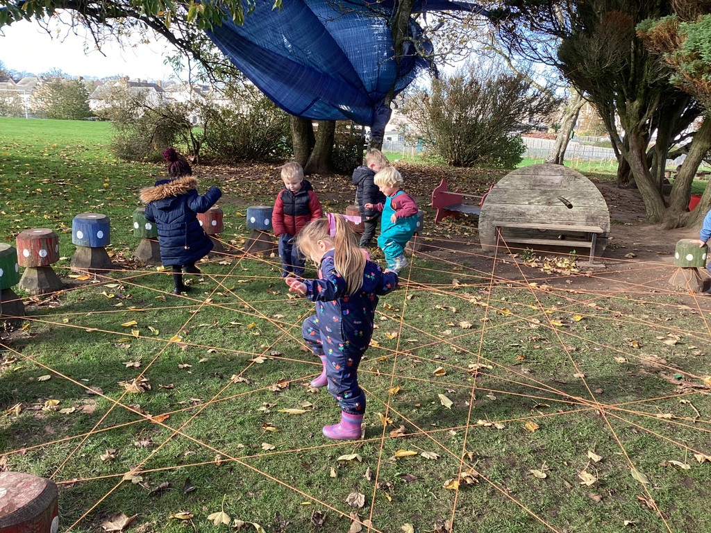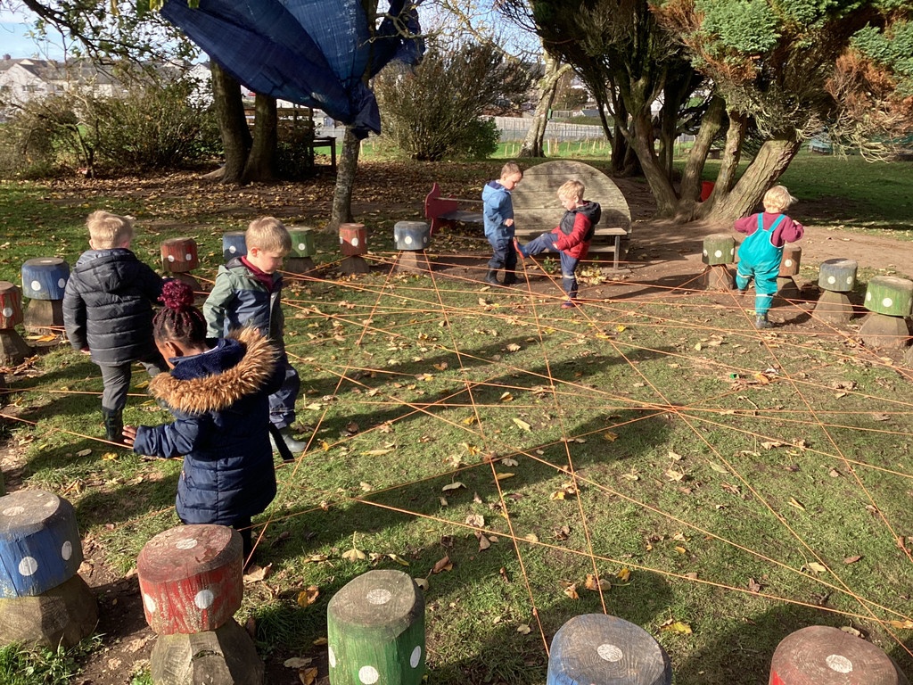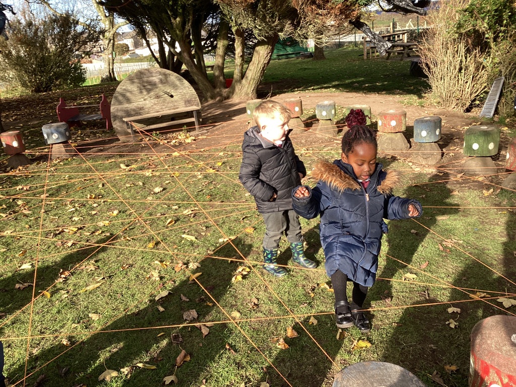 During forest school Thursday the Nursery 3s children enjoyed using their gross motor skills and problem solving to get across the spiders web with out waking up the spider. They did well as controlling their bodies and balancing!